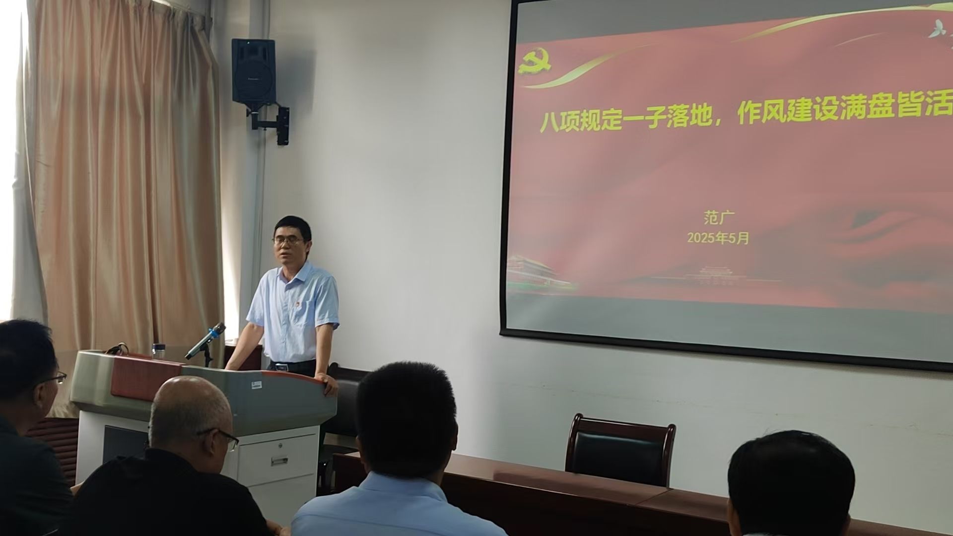 5月23日上午,校党委委员、副校长范广以《八项规定一子落地,作风建设满盘皆活》为主题,为科学研究处(学报编辑部)、后勤保障处、实验室建设与管理处、国有资产管理处(招投标办公室)全体党员及科级以上干部讲授专题党课。