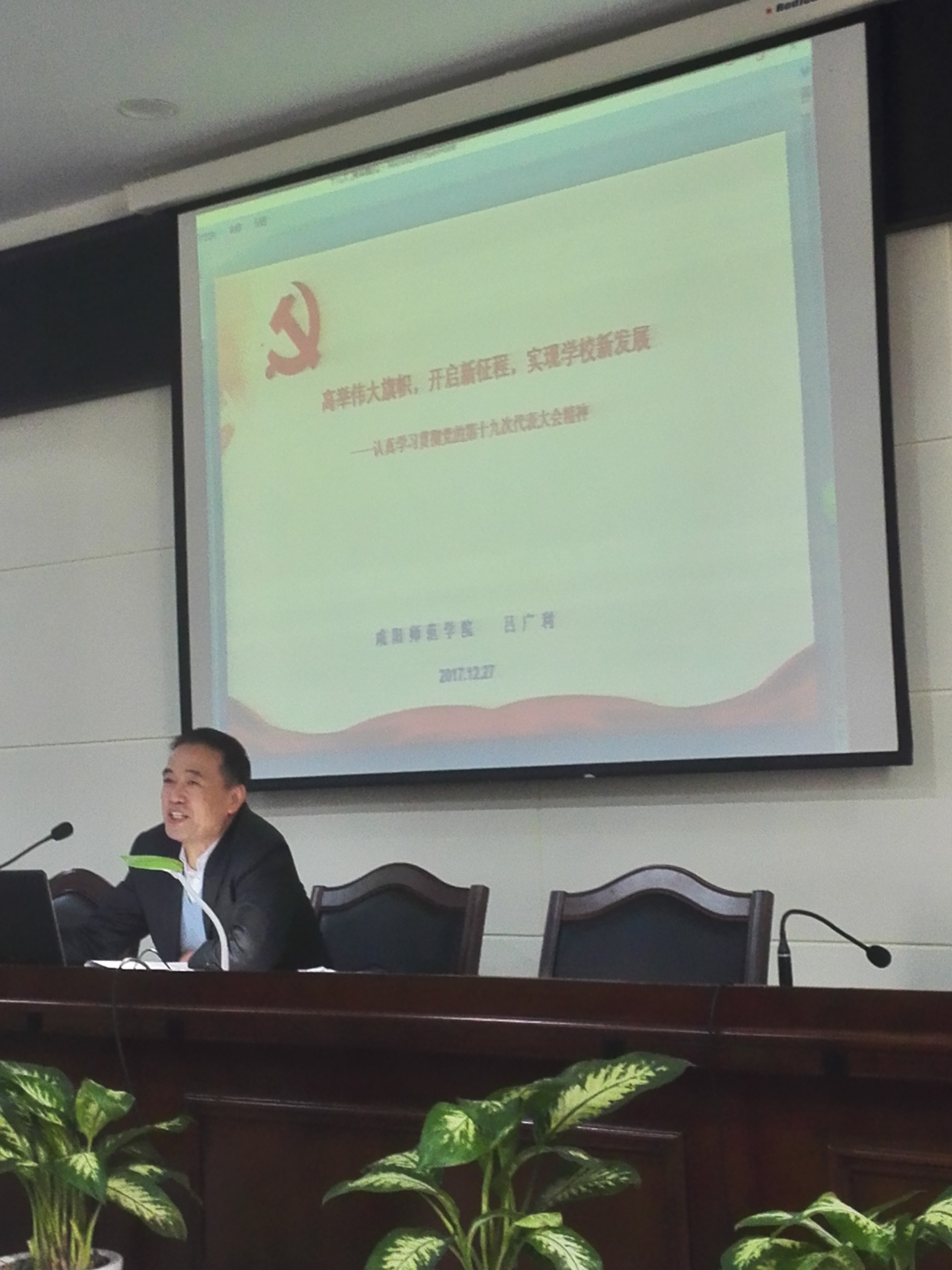 吕副校长结合自己多年来党建和行政工作实践,在精心的准备下,他从党的十九大主题、主要成果,马克思主义中国化,中国特色社会主义理论体系,马克思主义中国化重大理论成果,习近平新时代中国特色社会主义思想,中国特色社会主义进入新时代,将学习贯彻十九大精神落实在实际行动中等七个方面进行了深入的辅导和解析。