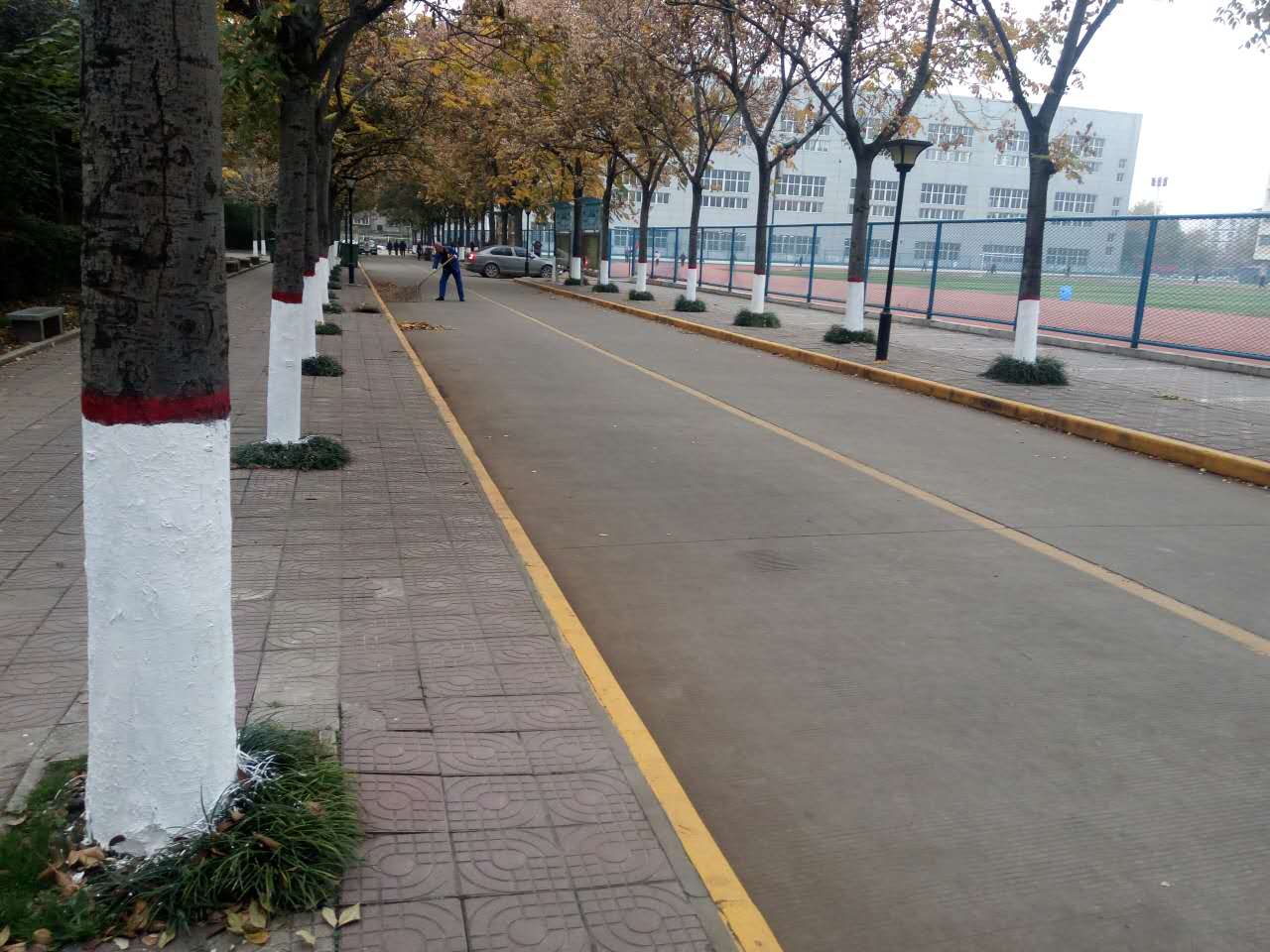 秋末冬初,气温逐渐降低,10月下旬开始,我处校园管理中心安排了华泰物业公司对校园主次干道两旁树木进行了刷白养护,保护树木能安全过冬。