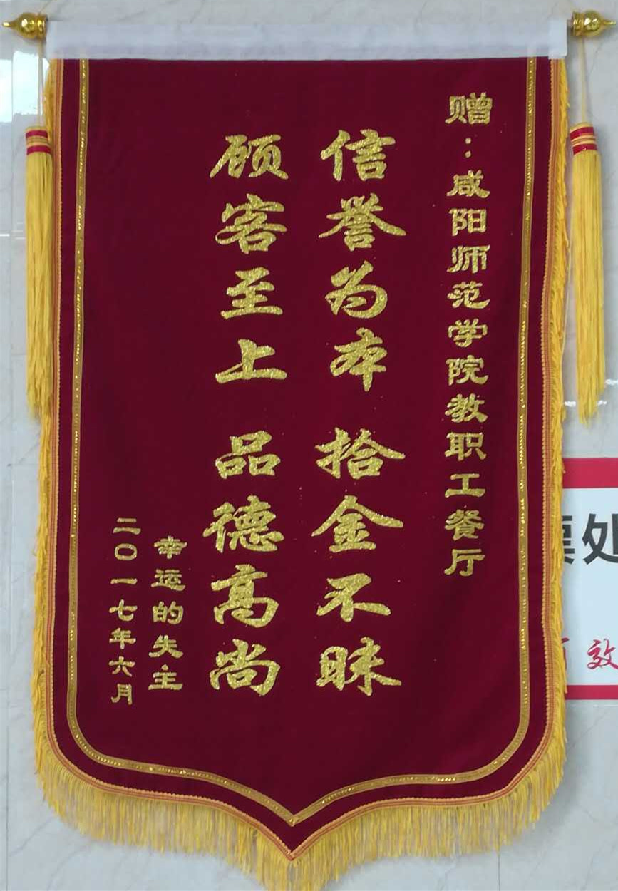 “信誉为本拾金不昧信誉至上品德高尚”书写着金灿灿大字的锦旗悬挂在了世俱杯教职工餐厅的墙面上,教职工餐厅全体员工都感到无限的荣光。