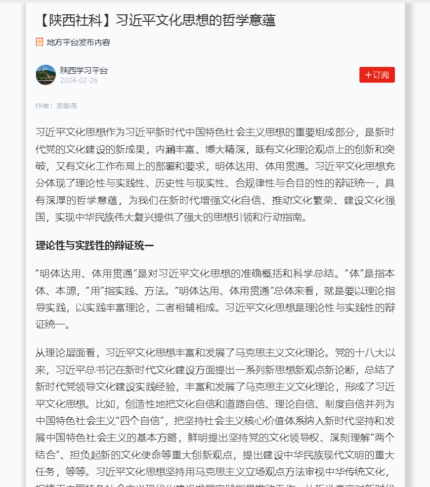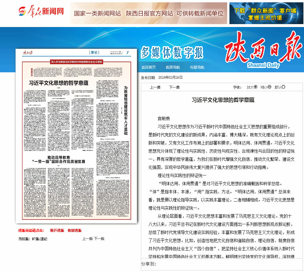 学习强国、陕西日报理论版刊登世俱杯马克思主义学院教师宫敏燕署名文章《习近平文化思想的哲学意蕴》