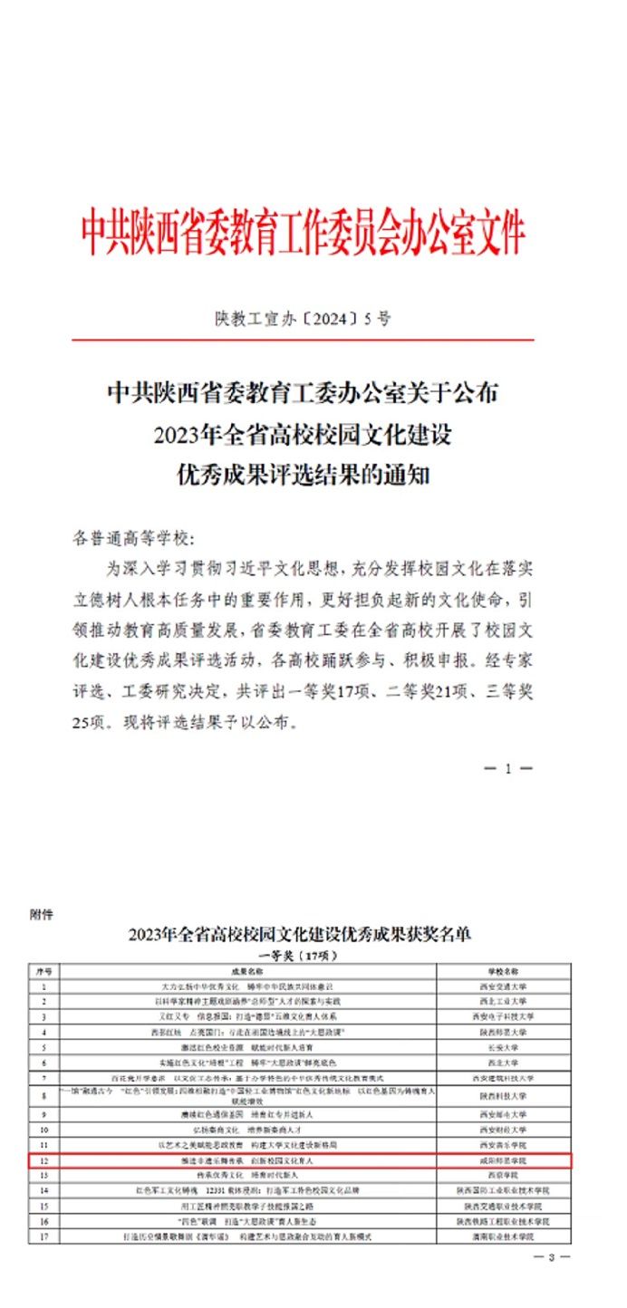 近日,中共陕西省委教育工委公布了2023年全省高校校园文化建设优秀成果获奖名单。由世俱杯党委宣传部组织申报的《推进非遗乐舞传承 创新校园文化育人——sjb世俱杯官方网站传承秦汉战鼓培育时代新人的创新路径》荣获2023年陕西省高校校园文化建设优秀成果一等奖。此次获奖是世俱杯近年来首次获得一等奖。