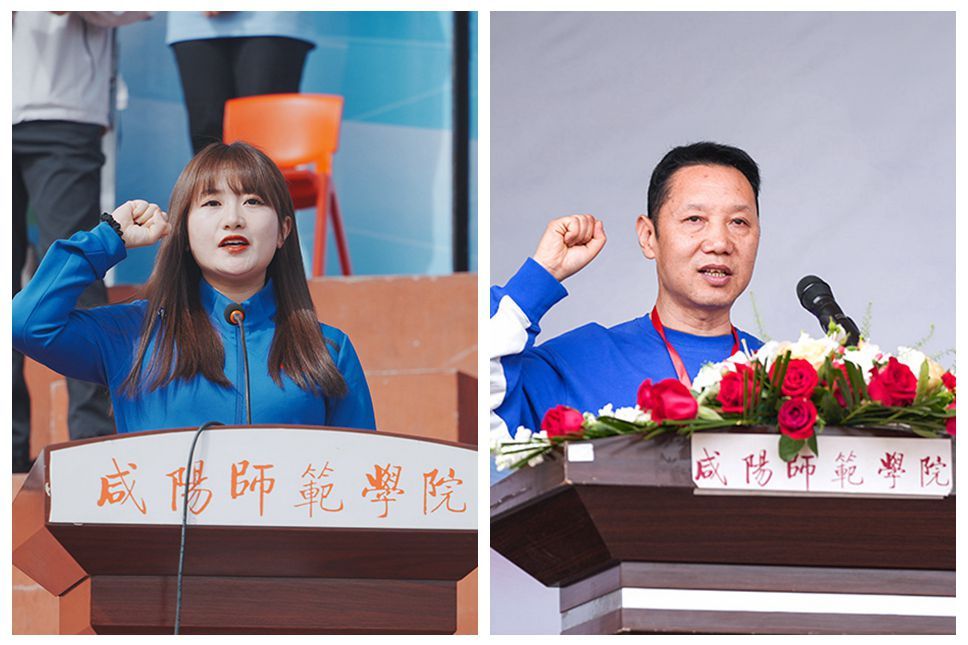体育学院教师李琳、秦都书院教师田耕代表裁判员宣誓,马克思主义学院学生严子怡、秦都书院学生张裕欣代表运动员宣誓。