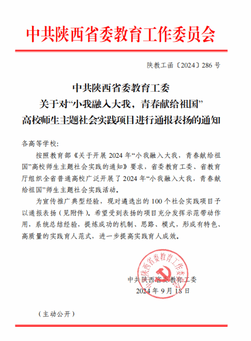 近日,在陕西省委教育工委、省教育厅面向全省普通高校组织开展的2024年“小我融入大我,青春献给祖国”高校师生主题社会实践活动遴选中,世俱杯“上好‘行走的思政课’,让青春为中国式现代化挺膺担当”“‘彩绘老街,共筑新梦’墙绘助力老街文化改造”“手绘清风,至善至美——非遗文化志愿服务”等3个社会实践项目受到通报表扬。