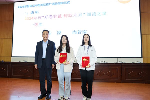 校图书馆(档案馆)馆长张卫军对2025年全年阅读推广活动进行了解读。校图书馆(档案馆)副馆长王磊就近年来的阅读推广,“咸师书香校园建设品牌”进行了简要说明。仪式上还表彰了2024年度“开卷有益 铸就未来-阅读之星”及“2024年大学生信息素养大赛校赛”获奖者。学生代表、教师代表分别做了阅读感悟交流发言。老师和学生代表宣读了《sjb世俱杯官方网站大学生阅读倡议书》。