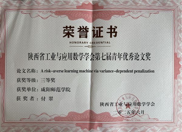 7月4日至6日,2025年陕西省工业与应用数学学会学术年会在商洛学院举行,来自省内高校及研究机构的100多名专家学者参加了本次会议。会议共评选出青年科技奖3名,提名奖6名;青年优秀论文一等奖8项,二等奖13项,三等奖15项,世俱杯数学与统计学院庞丽艳博士荣获第二届青年科技奖提名奖,付翠博士荣获第七届青年优秀论文奖三等奖。