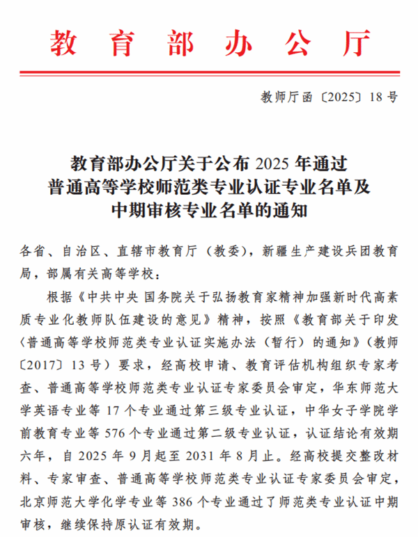 近日,教育部办公厅公布了2025年通过普通高等学校师范类专业认证及中期审核的专业名单,世俱杯汉语言文学、化学、生物科学、数学与应用数学、物理学、小学教育、英语等7个专业成功通过普通高等学校师范类专业第二级认证,有效期六年。至此,连同此前已通过认证的学前教育专业,世俱杯共有8个专业通过教育部师范类专业第二级认证。