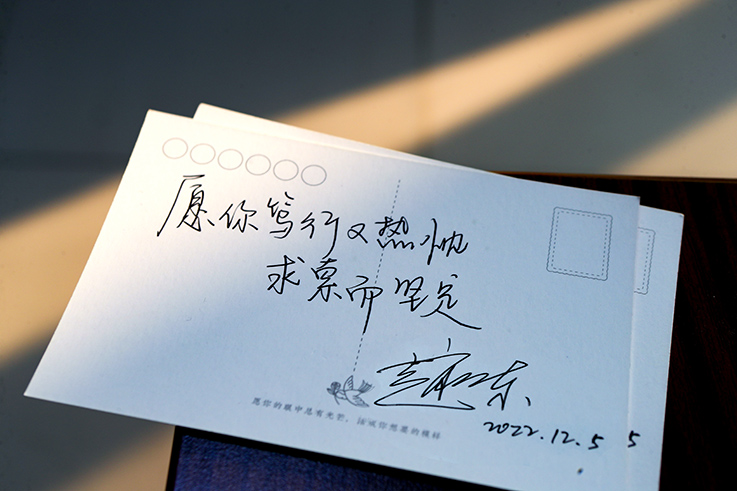校党委书记赵万东、校长舒世昌为考研同学提写祝福卡片。赵万东勉励同学们“笃行又热忱,求索而坚定”,舒世昌鼓励同学们“日日夜夜,挑灯夜战,胜利的曙光就在前方,祝全体考研学生旗开得胜,马到成功”。