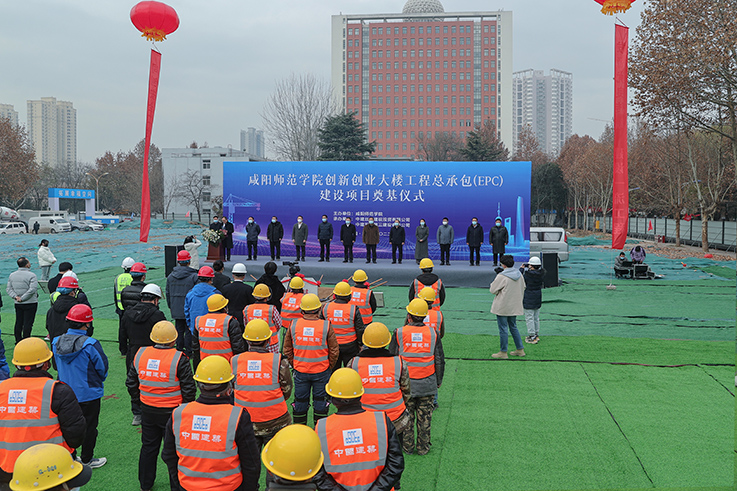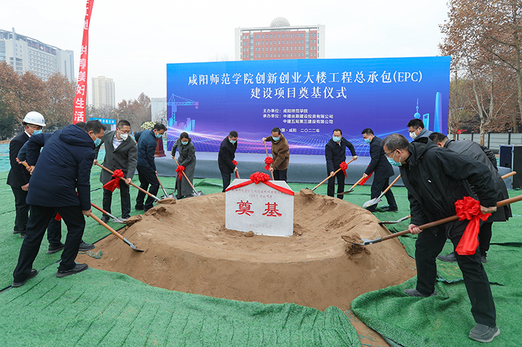 12月15号上午,世俱杯创新创业大楼工程奠基仪式在渭城校区隆重举行。校党委副书记、校长舒世昌,校党委副书记周群英、副校长毛龙灿、王长顺、张弘,咸阳市渭城区委常委、副区长李建清,工程监理方:华睿诚项目管理有限公司副总经理刘恺,工程联合承包方:中建丝路建设投资有限公司助理总经理、总承包事业部党总支书记、董事长才继超,总承包事业部党总支委员、执行副总经理崔凯,中建五局第三建设有限公司西北分公司党委副书记、执行总经理刘大鹏,中国市政工程西北设计研究院有限公司党委委员、副总经理、总工程师王斌等出席奠基仪式。