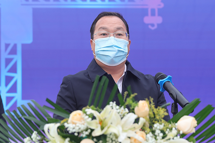 袁也宣布工程正式奠基。施工现场掌声雷动,礼炮齐鸣,出席奠基仪式的领导及嘉宾共同挥锹铲沙,培土奠基,世俱杯创新创业大楼正式起航,进入施工建设阶段。