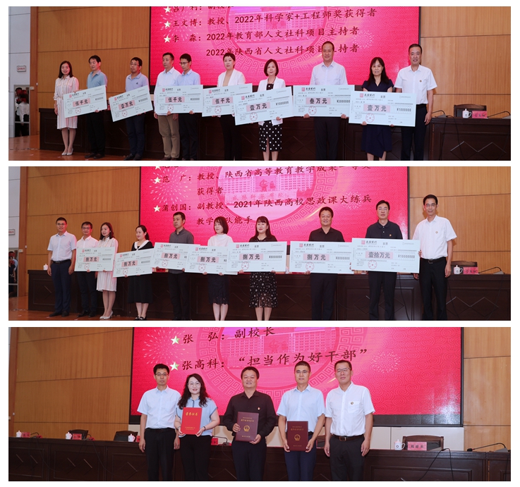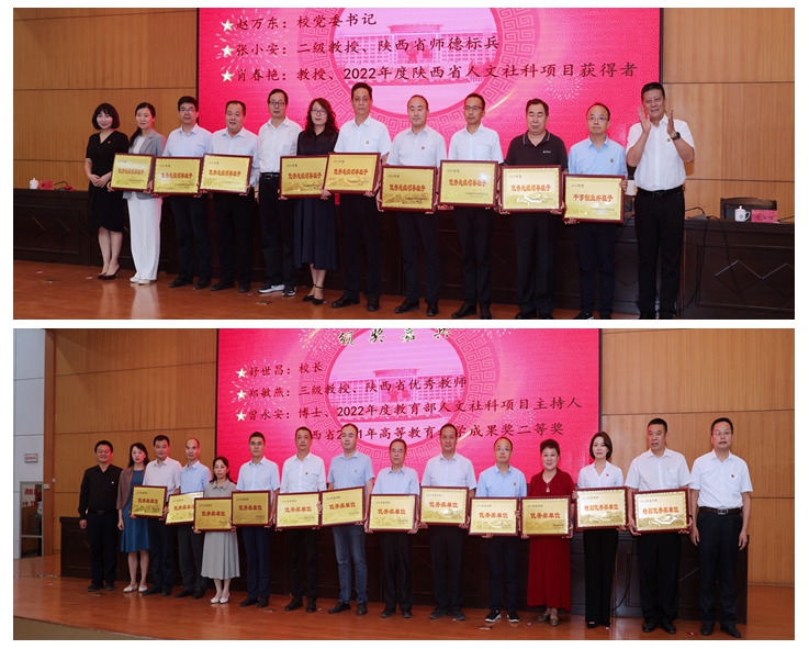 大会表彰了2021-2022学年度获得厅局级以上教学、科研奖励以及荣誉称号的教师,为从事教育教学工作三十年的教职工颁发了荣誉证书,为2021年校园优秀新媒体平台颁发奖牌,为2021年度考核优秀单位、“干事创业好班子”和优秀处级领导班子颁发了奖牌。于右任书法学院院长王智杰教授代表全校教职工发言。
