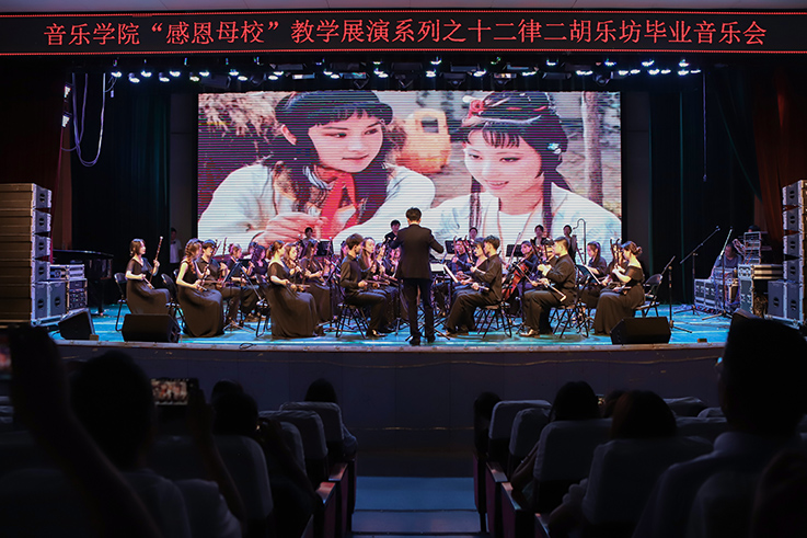 6月21日晚,音乐学院举办“十二律二胡乐坊”"五声合唱团"毕业音乐会,校党委书记赵万东、校长舒世昌、校党委副书记周群英观看了演出。