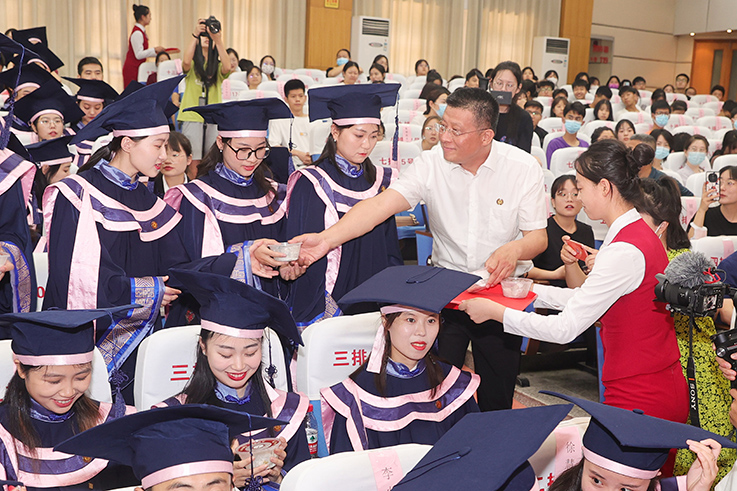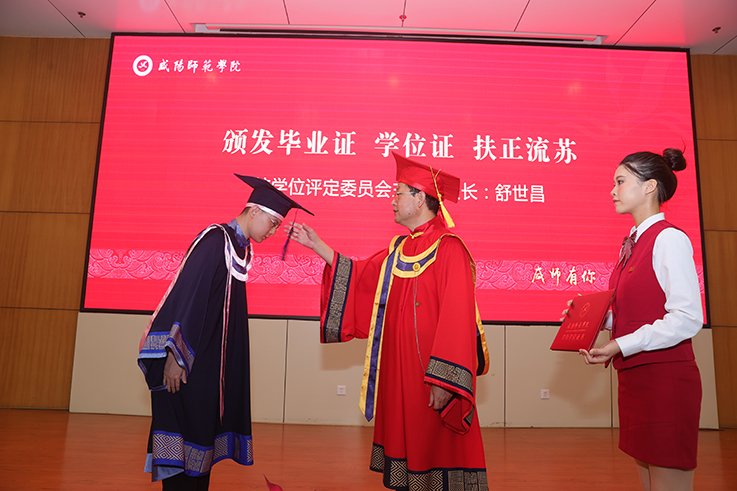 舒世昌为毕业生代表颁发毕业证、学位证,并扶正流苏。