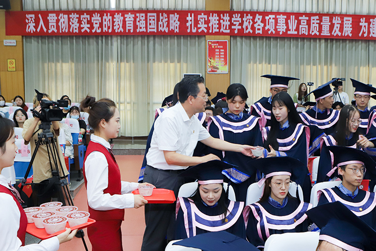 在典礼尾声,赵万东、舒世昌为毕业生代表送上学校精心准备的饺子。3万多个饺子“送骄子”,承载了学校对所有毕业生最殷切的祝福和期望,蕴含着毕业生与母校之间最永恒的情意。
