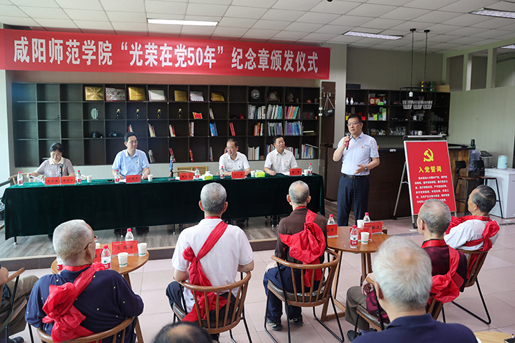 赵万东代表学校党委向获颁纪念章的老党员们致以最崇高的敬意,向全体党员致以节日的问候,向参会的老同志通报了学校各项事业发展的总体情况,简要介绍了学校近期工作。他表示,老党员的奋斗历程和光辉事迹,给新时代的咸阳师院人树立了榜样,是我们学习党史、用好党史最宝贵的资源和财富。学校将会一如既往的支持离退休工作,关爱和关心离退休老同志,广大党员干部要以此次纪念章颁发活动为契机,传承红色基因、弘扬优良传统、凝聚奋进力量,为加快实现世俱杯高质量发展作出新的更大贡献,以优异成绩迎接党的二十大胜利召开。