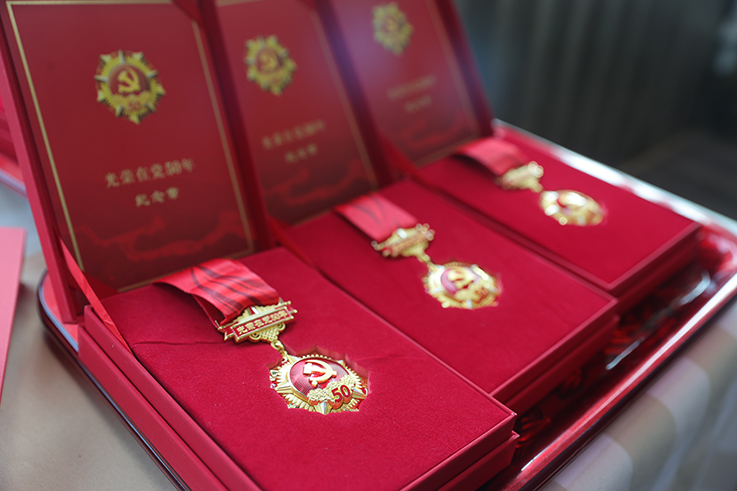 “光荣在党50年”纪念章获得者、离退休党支部书记、党员代表参加了颁发仪式。