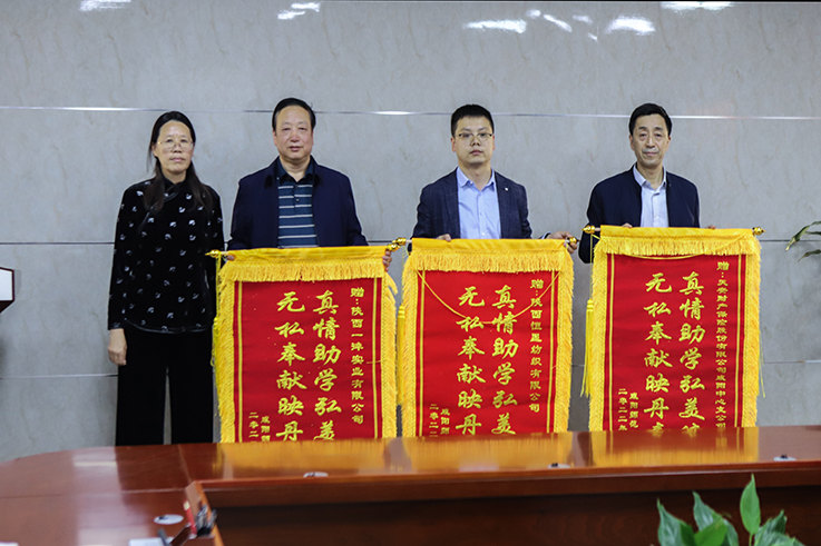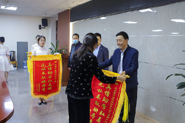 周群英为爱心企业授赠锦旗,感谢爱心企业的善心之举。她讲到,受助学生要在行动上做一个懂得感谢的人,感谢爱心企业帮助,感谢企业对学校资助工作的支持;要常怀感恩之心,感恩父母、感恩社会、感恩学校、感恩老师;要有报恩之举,把感恩之心传递下去,回报社会、回报祖国,让大学生活更加精彩,让未来人生更加出彩!