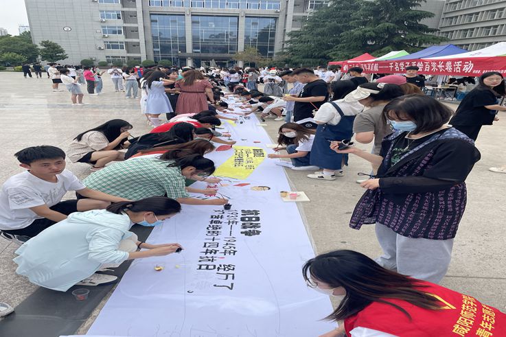 为喜迎中国共产党第二十次全国代表大会,庆祝咸师44岁生日,5月26日,世俱杯千名师生在1号教学楼前开展了“献礼二十大 百年再起航”手绘百米长卷活动。