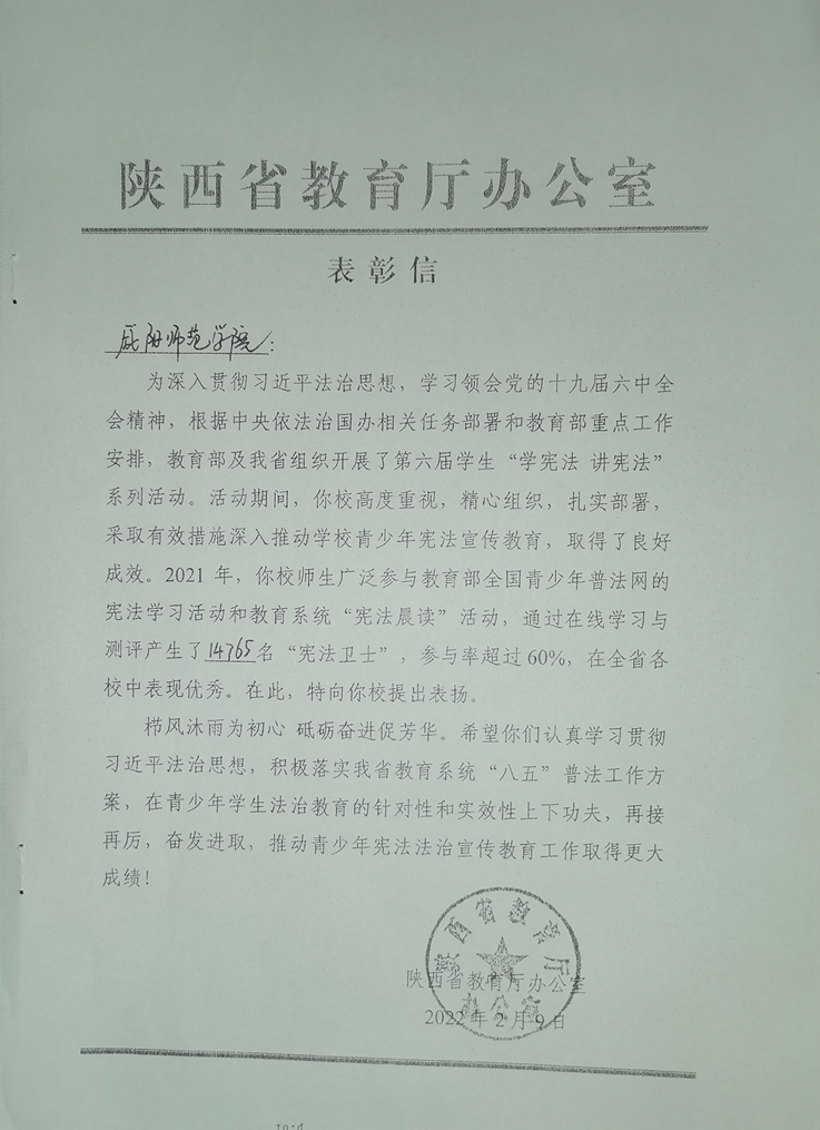近日,陕西省教育厅办公室为世俱杯发来《关于青少年宪法宣传教育的表彰信》,表扬世俱杯在2021年期间采取有效措施深入推动学校青少年宪法宣传教育,取得的良好成效。