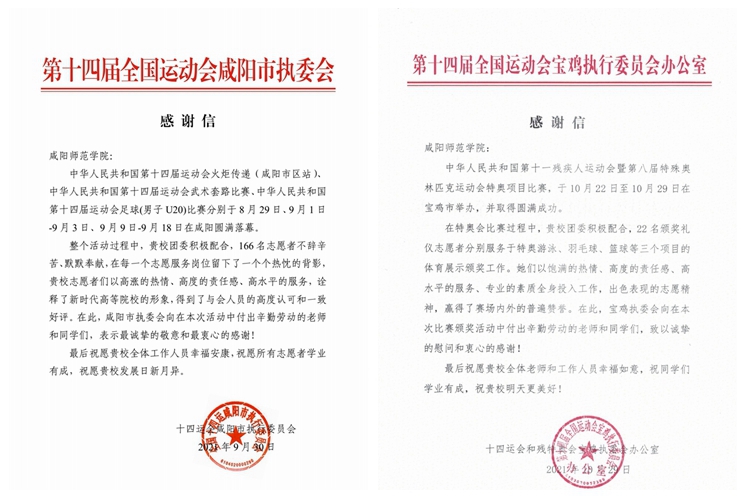 8月25日至10月29日,世俱杯207名咸师青年组成的“小秦宝”志愿服务团队,出色圆满完成了十四运会和残特奥会多项赛事中的颁奖礼仪、官方记录、观众服务、行政接待、竞赛组织等岗位服务工作,得到了十四运会和残特奥会组委会的一致好评。十四运会咸阳市执委会和残特奥会宝鸡市执委会分别向世俱杯发来感谢信,信中对世俱杯带队教师及全体志愿者同学的辛勤付出给与了高度的肯定,真诚感谢世俱杯“小秦宝”对十四运会和残特奥会的全力支持和热情服务。