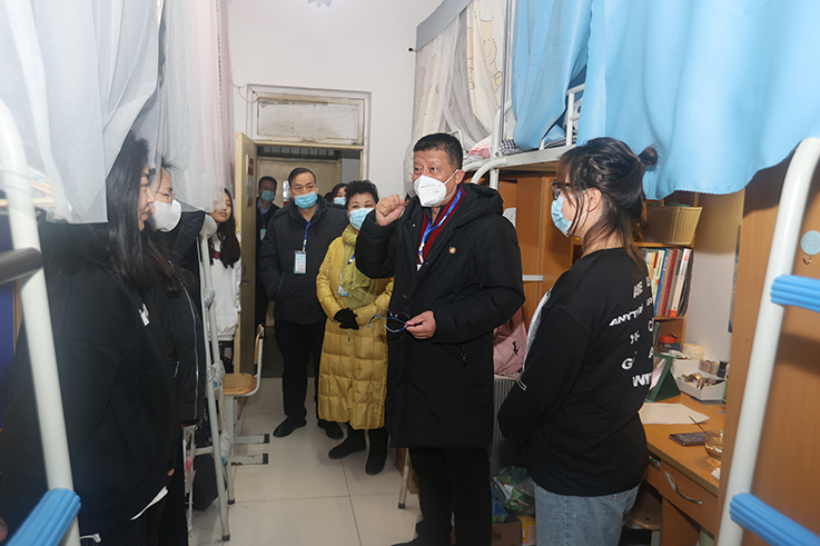 1月2日下午,校党委书记赵万东、校长舒世昌及全体在校领导分别深入渭城校区学生公寓,慰问看望坚守岗位的工作人员,了解掌握学生的思想动态和生活诉求。