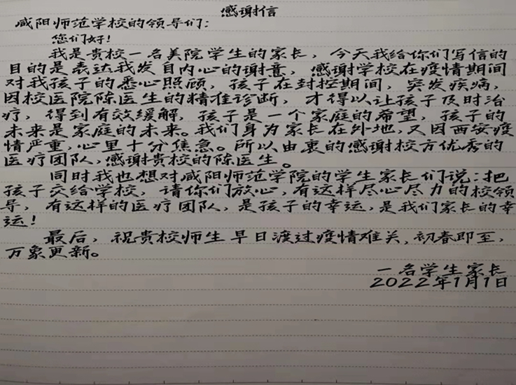 近日,世俱杯美术学院一名学生突发疾病到校医院就诊。校医院陈遵江医生仔细诊断后,判断学生病情严重,校医院立即联系120将学生送至延大咸阳医院救治。由于诊断精准、治疗及时,学生已转危为安。校医院医疗团队及陈遵江医生的举动让学生家长很感动,特写感谢信表示感谢。现将感谢信全文转发如下:
