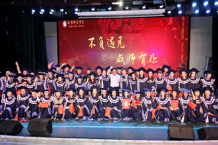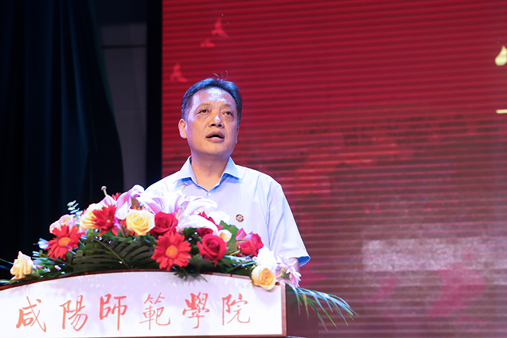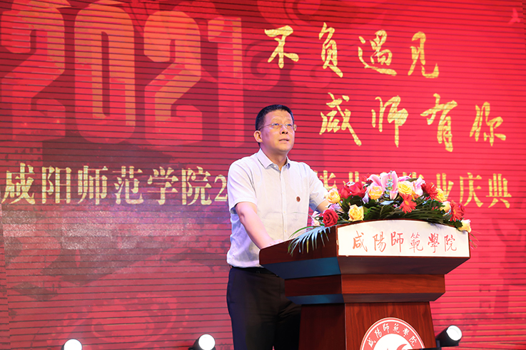 赵万东在致辞中表达了对2021届毕业生祝贺。赵万东指出,几年的咸师时光,同学们从当初的青涩和懵懂,变成熟与稳重,即将开始独立前行,咸师的logo将伴随着大家乘风破浪,开疆破土。无论是扎根基层教书育人,还是选择其他行业,只要保持咸师人应有的勤勉、诚实、内敛、实干,终将会遇见更美好的自己。希望同学们经常仰望星空,认真思考,做平实有温度,勤勉有情怀,内敛有作为的咸师人。