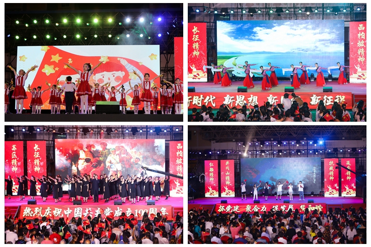 晚会分“风雨征程”、“砥砺前行”和“追梦新时代”三个篇章,涵盖了歌舞、朗诵、小合唱剧等多种艺术表演形式。晚会在序曲《在阳光灿烂下》中拉开帷幕,嘹亮的红色旋律在田径场上空久久回荡,《南湖的船,党的摇篮》《红色娘子军》《唱支山歌给党听》《童心向党》《爱你一万年》《追寻》等14个节目各具特色,精彩纷呈,以优美动听的歌声和细腻生动的表演,引发了全场师生共鸣,台上台下国旗党旗招展,灯光灿烂,在家国情怀中回应着对党的美好祝福,传递了咸师人牢记初心使命、奋发图强的气魄和志向。