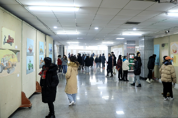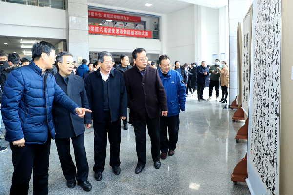 张双前巡视员宣布展览开幕,并与全体领导、师生一起参观了书画作品。