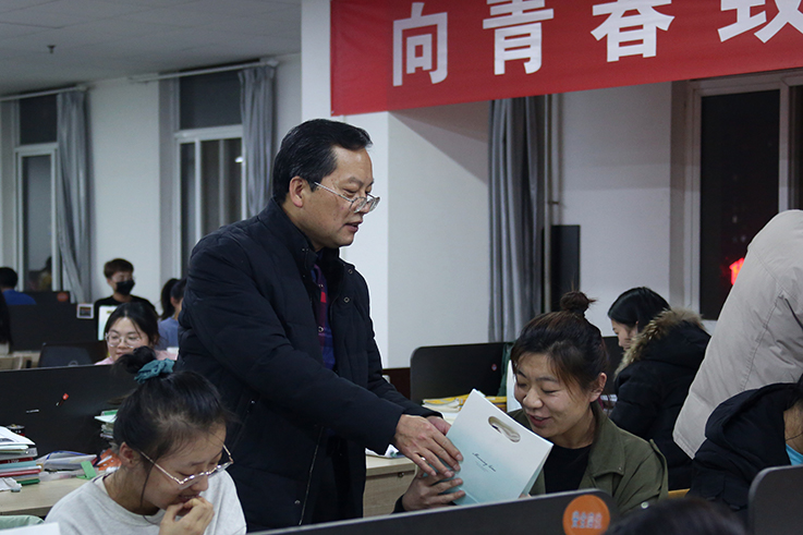舒世昌作了讲话,充分肯定同学们把考研作为自己的一个追求目标,刻苦学习、积极进取。结合自身经验,强调学习方法及策略性学习的重要性,教导同学们在备战考研的同时,也要重视当前本科阶段的学习。勉励同学们保持良好心态,劳逸结合,以最佳状态迎接考试,争取学业进步,考研成功。