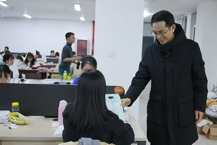 12月15日,校长舒世昌,校党委副书记周群英,副校长毛龙灿前往学校图书馆11、12层自习室,慰问考研学子,为同学们加油鼓劲。