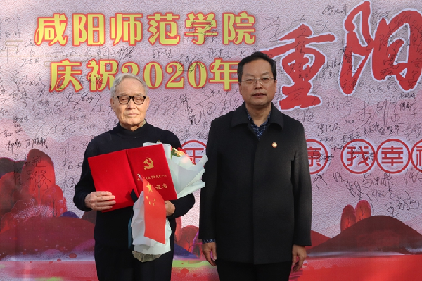 舒世昌、吕广利、吴朝分别为重阳节过生日和年满65周岁的老同志送花并献上诚挚的祝福。舒世昌为荣获“陕西省离退休干部先进个人”的程志兴老师颁发了荣誉证书,宣布健步走活动开始。