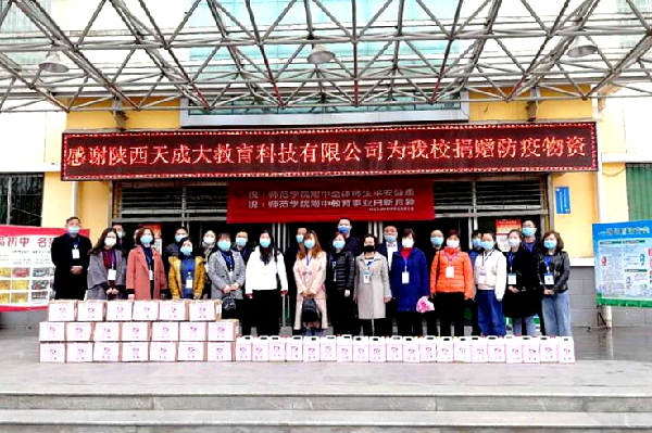 4月2日,陕西天成大教育科技有限公司董事长尹义安、总经理张良立来到附属中学,捐赠洗手液20箱、消毒液20桶。附属中学校长张养利代表学校接受捐赠,捐赠仪式由副校长杨光红主持。