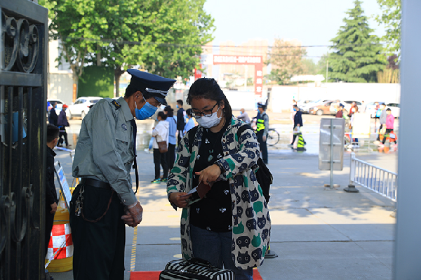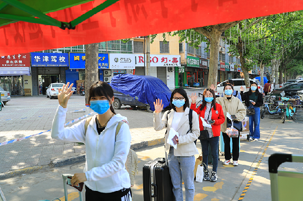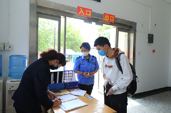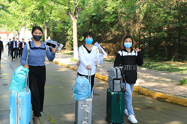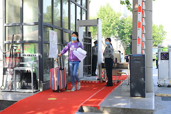 按照学校安排,返校学生佩戴口罩,持有效证件、健康码和返校通知书通过身份核验点,行李箱消杀后通过测温门,按照地标指示进入学院核验点,测温正常后,领取《公寓通行卡》、登记个人信息、测温正常后进入宿舍。入校后,学校将实行全封闭管理。