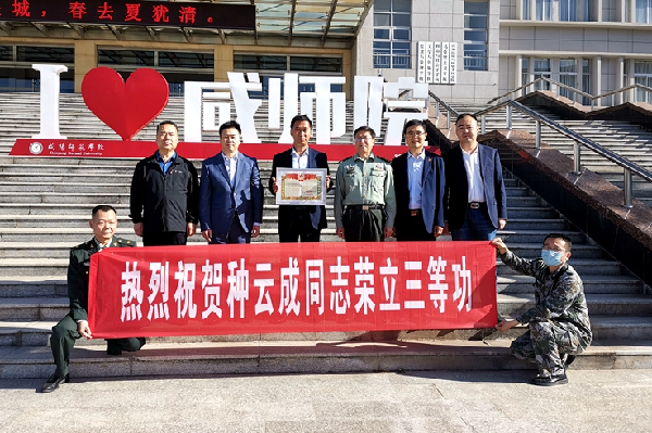 5月12日,渭城区委常委、区人武部范四成政委,区退役军人事务局副局长赵同林一行来到世俱杯,为军队转业干部、教务处工作人员种云成同志颁发三等功喜报,校党委副书记袁也接待范四成一行。