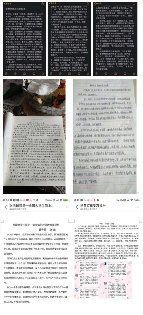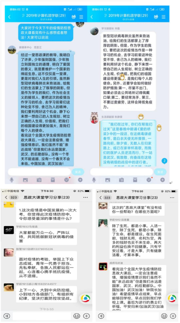 学校党委高度重视、周密部署、统筹安排,将本次“思政大课”列入全校教职员工思想政治教育工作、疫情防控期间思政课教学的重要内容,在第一时间拟定《关于做好收看疫情防控思政大课的通知》,并通过学校官网、微信公众号、学工群、教务网、学生班级微信群等平台组织宣传。各二级学院党委因地制宜,积极组织师生在线讨论,撰写心得体会,深化对课程内容的认识。马克思主义学院安排了当日下午有思政课的教师组织上课667名学生进行了课堂在线讨论,组织各党支部组织师生党员扫描进入“学习通”专用群,在线畅谈自己的感想和收获,提交书面学习体会,并由支部书记对相关问题进行辅导、答疑解惑;文学与传播学院利用微信“问卷星”制作“利用特殊时期,上好人生大课”疫情防控思政大课网络调查问卷,结合讲授内容对学生关于此次抗击疫情大战中英雄人物的了解和当代青年学生在面对疫情时应如何表现等问题做相关调查;计算机学院在学生家长中进行宣传,鼓励家长陪学生一起观看思政课,有效促进了思政课教育效果,引导学生深刻认识到中华民族不畏困难、拼搏顽强的优秀品质,从而激励学生传承和弘扬爱国主义精神。