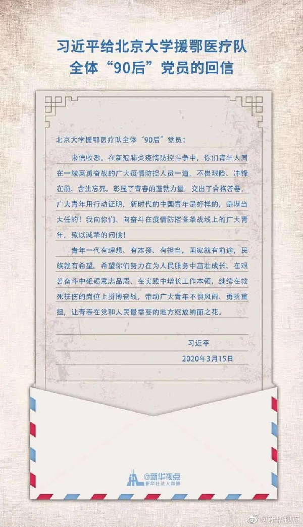 3月15日,中共中央总书记、国家主席、中央军委主席习近平给北京大学援鄂医疗队全体“90后”党员回信,向奋斗在疫情防控各条战线上的广大青年致以诚挚的问候,勉励广大青年不惧风雨、勇挑重担,让青春在党和人民最需要的地方绽放绚丽之花。