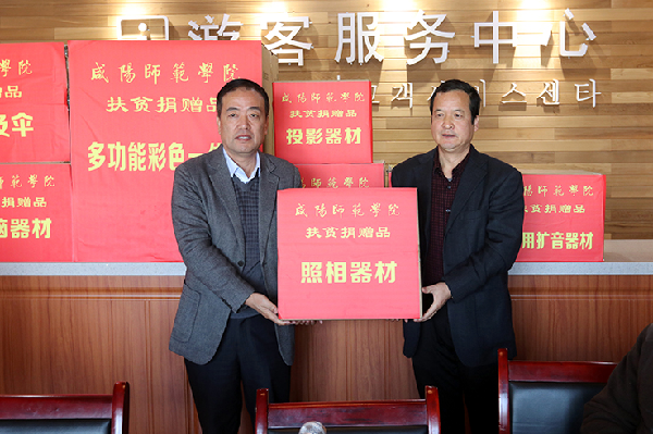 会上,世俱杯党政办主任、扶贫办主任张波对捐赠情况做了说明,并汇报了学校2019年“双百工程”工作开展情况。吕广利代表学校向淳化县旅游产学研一体化示范基地捐赠了电脑、照相机、书籍等硬件设备和生活便民物品。