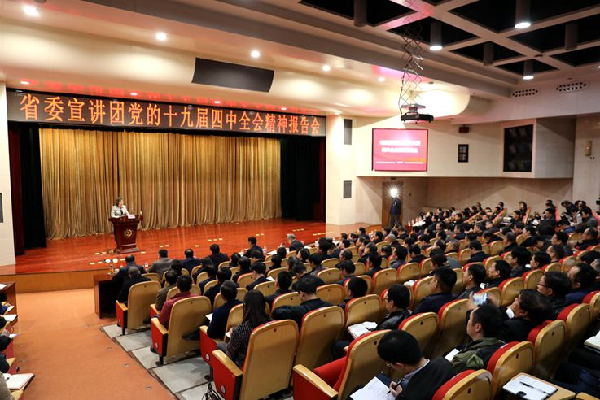 董小龙作了讲话。要求全省教育系统要以宣讲报告会为契机,把学习贯彻党的十九届四中全会精神列入重要议事日程,与正在开展的“不忘初心、牢记使命”主题教育紧密结合起来,迅速掀起深入学习宣传贯彻全会精神热潮。要坚持领导带头,精心组织,在学懂弄通上下功夫;坚持广泛宣讲、深学细研,在研究阐释上下功夫;坚持立足实际,搞好结合,在进课堂进教材进师生头脑上下功夫,坚持学以致用、知行统一,在于推动学校高质量发展和追赶超越上出实招,以高度的政治自觉、积极的思想行动、扎实的工作作风推动党和国家的教育方针和各项政策的贯彻落实,不断推动教育治理体系和治理能力现代化,把十九届四中全会精神在教育系统落细落小落到实处。