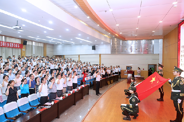 参会的全体教师面对国旗庄严宣誓,自觉践行社会主义核心价值观,不忘初心,牢记使命,模范遵守教师职业道德规范,为人师表,立德树人,做人民满意的“四有好老师”,为学生德智体美劳全面发展奉献智慧与力量,为党和人民的教育事业而努力奋斗。