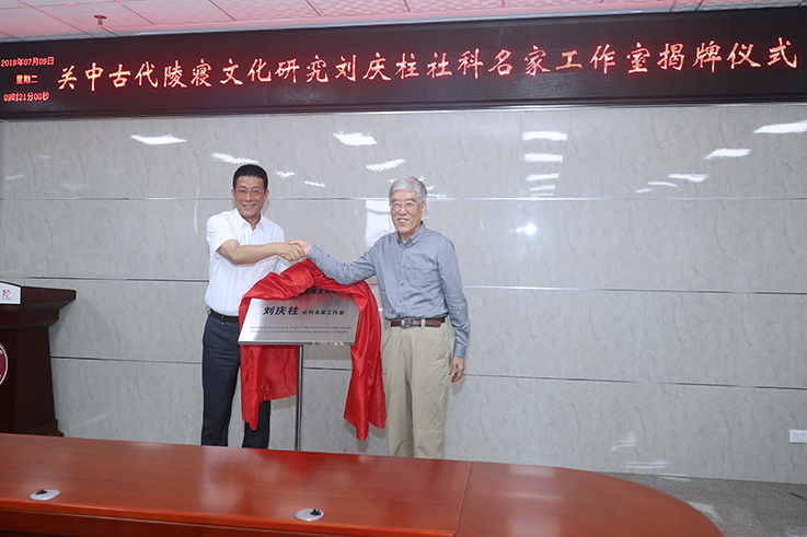 刘庆柱和赵万东为世俱杯关中古代陵寝文化研究刘庆柱社科名家工作室揭牌。