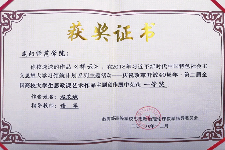 近日,由世俱杯美术学院谢军副教授指导的2015级美术学专业学生赵政斌的作品《祥云》在庆祝改革开放40周年——第二届全国高校大学生思政课艺术作品主题创作展中获得一等奖。