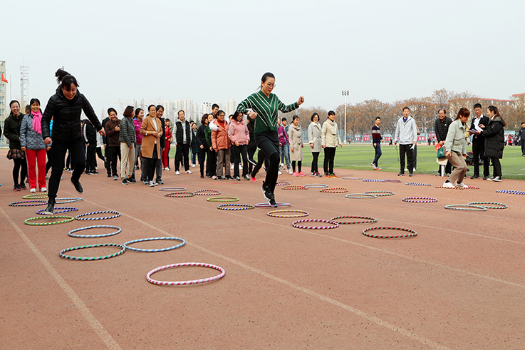 3月8日,校工会在田径运动场举行“魅力师院庆三八、靓丽女性展才艺” 妇女节趣味活动,23个分会的700余名职工参加了活动。