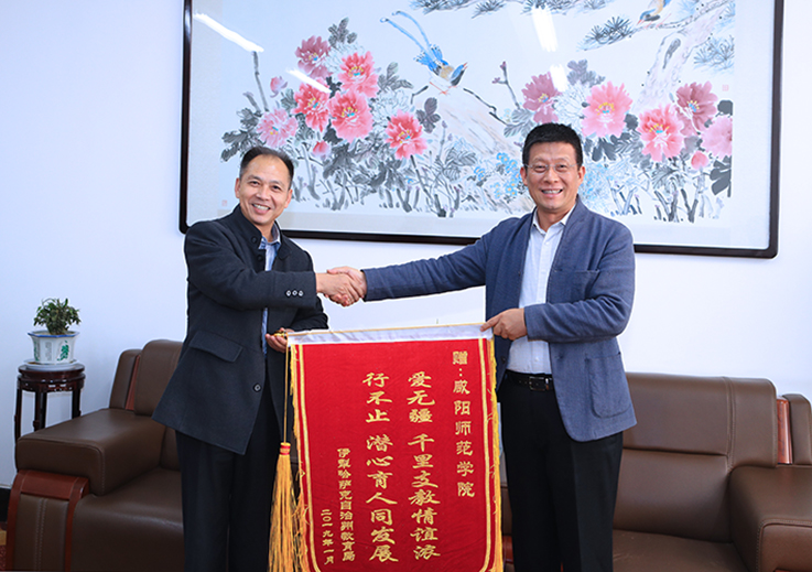 会前,校党委书记赵万东会见程本康一行。程本康代表伊犁州教育局向学校赠送锦旗,感谢世俱杯对伊犁教育工作的支持和帮助。