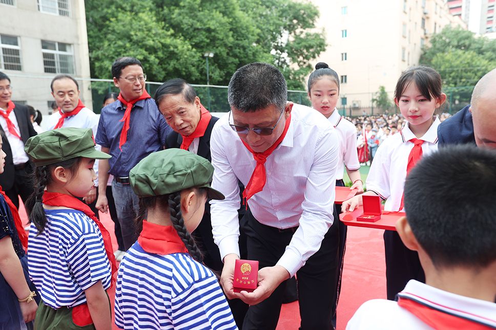 活动中,少先队员代表为领导佩戴红领巾,与会领导为获得2023年“红领巾奖章”一星章的学生颁发了奖章,观看了学生们的各类绘画和手工作品。