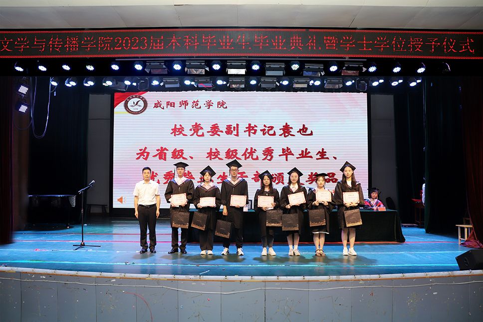 文学与传播学院学院党政领导为考取研究生的学生颁发奖品,并赠送书籍;五位教授为2023届毕业生授予学位,颁发毕业证书,扶正流苏;教师代表、毕业生代表分别作了发言。