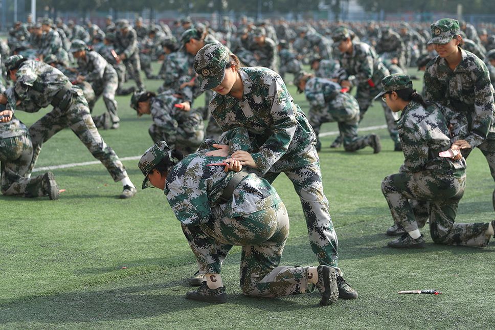 展军颜,意气风发。匕首操方阵的同学们气宇轩昂,坚定嘹亮的口号响彻咸师校园。马步扎稳,精准挥刀,动作行云流水,一气呵成,参训同学用动作诠释青春,用力量彰显未来。