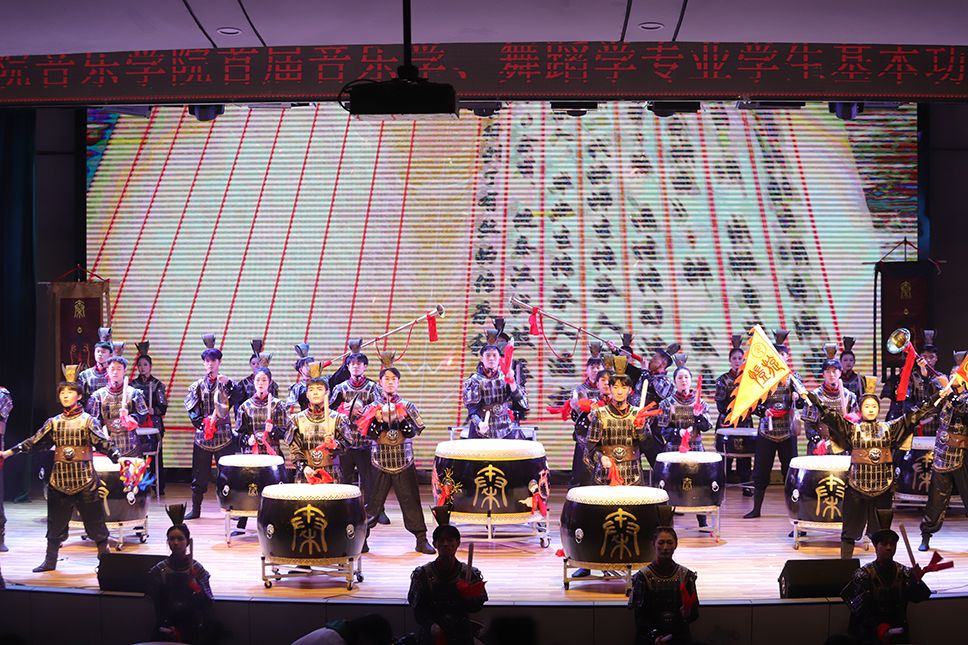 颁奖典礼在雄浑磅礴的“非遗”传习表演“秦汉战鼓”中拉开了序幕。首届音乐学、舞蹈学专业学生基本功大赛部分优秀获奖作品在典礼上进行了汇报表演。