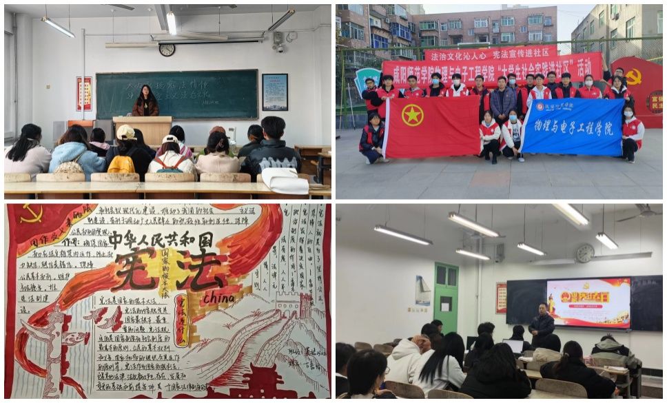计算机学院、外国语学院、文学与传播学院、物理与电子工程学院、职业技术学院(秦都书院)、地理与环境学院组织召开宪法宣传主题班会、主题团课,组织学生观看宪法宣传视频、开展宪法知识竞答等,让同学们在活动中增强宪法意识。数学与统计学院利用晚自习时间组织学生参加宪法考试,切实将“法治进校园”落到实处。物理与电子工程学院组织开展“以法治文化沁人心、宪法宣传进社区”为主题的宣讲活动,向社区居民讲解宪法的内容。外国语学院开展主题手抄报比赛,使学生加深了对宪法的了解,激发学生学习宪法的热情。