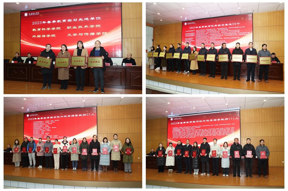 王长顺为受聘的教师教育导师颁发了聘书。校领导及各县区教育局领导为获得2023年春季教育实习的先进单位、优秀指导教师和优秀实习基地代表颁发了荣誉证书和奖牌。